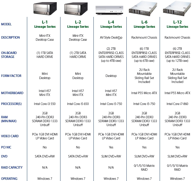 L-1 & L-2 | Ideal for single, small application | 1TB-2TB internal storage included, depending on model | Mini-ITX | Intel Core i3 550 or Intel Core i5-650 based on model |